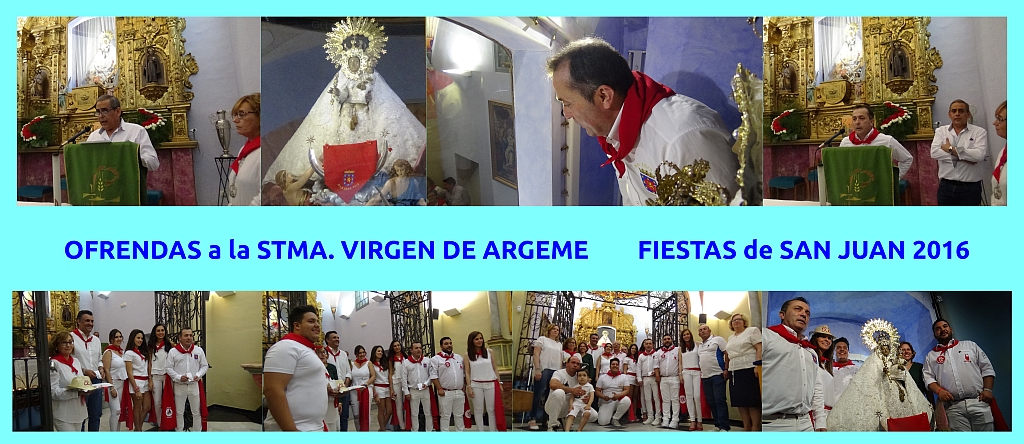 En el Santuario de la Patrona y Madre de Coria, la Stma. Virgen de Arageme, ante las inminentes Fiestas en honor del Señor San Juan, los Abanderados, Peñas, Reina y Damas, Alcalde de Coria y muchas personas celebraron un sencillo y muy emotivo acto, como es el de ofrecer a la Virgen algo tan pequeño como las insignias que representan e identifican a los abanderados y peñas; pequeño de tamaño, pero que, al salir sinceramente del corazón, se convierte en la expresión de algo muy grande, como es el festejar a San Juan el Bautista teniendo presente a la Madre, en este caso para rogarle que los días en los que celebraremos una tradición ocho veces centenaria, tan antigua como la devoción a nuestra advocación de María, discurran de la forma más agradable posible.